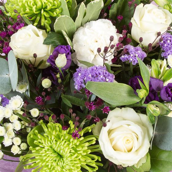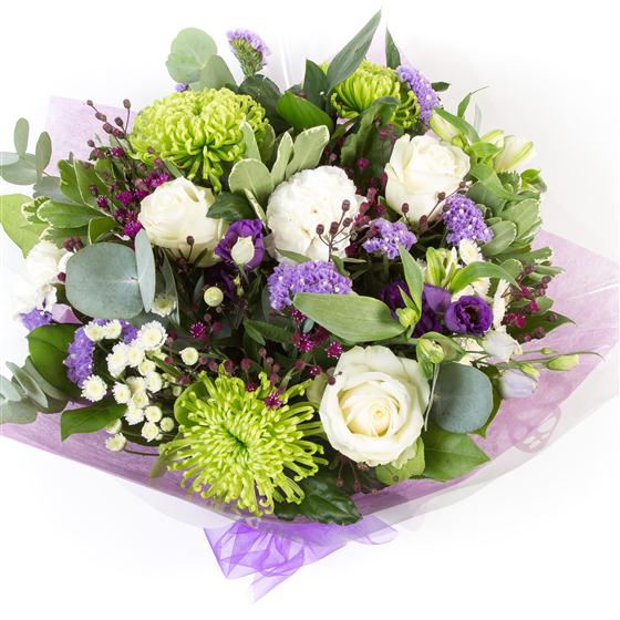 This hand-tied bouquet in shades of purple, and lime accented with white roses and alstromeria is a joy to receive.