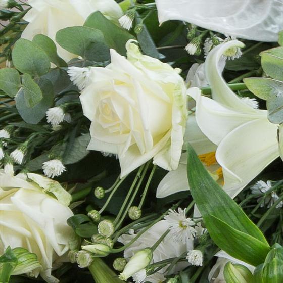 A simple combination of cream and white blooms and unusual greens. Anthuriums, lilies and roses are included in this stylish bouquet.