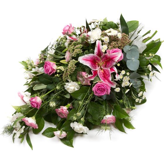 A pretty and feminine spray of pink and cream blooms including stargazer lilies, lisianthus and alstromeria with delicate nigella.
