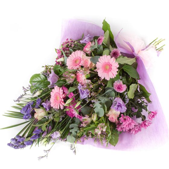A pretty bouquet in lilacs and pinks including aconitum, carnations, gerberas, wax flower and complementing foliage.